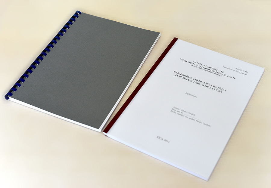 Lai Jūs varētu vizuāli novērtēt dažus salīdzinājuma raksturojumus, ieskatieties gatavo darbu bildes. Pieņemot lēmumu par iesiešanas veidu, atcerieties, ka diplomdarba iesiešana, tai skaitā otrā darba kopija, kura tiks izsniegta Jums tieši pirms darba aizstāvēšanas, dod iespēju radīt pozitīvu pirmo iespaidu atestācija komisijas acīs.